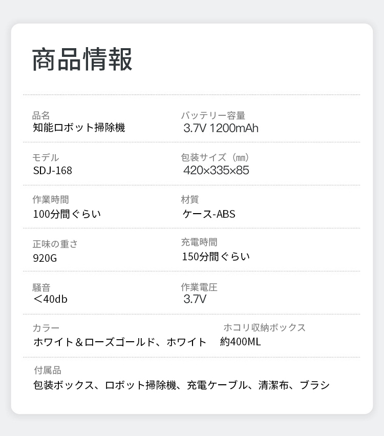 付属品:梱包箱、ロボットスイーパー、充電ケーブル、クリーニングクロス、ブラシ